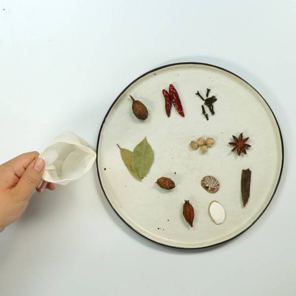 2、将草果、干辣椒、丁香、香叶、香果、肉蔻、八角、栀子、槟榔片、白芷、荜拨放入香料包中。