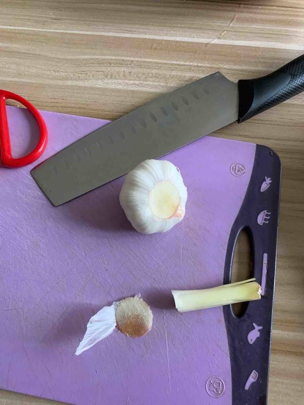 2、用过滤后的净水,加入少许盐,将大蒜浸泡24小时,24小时后将水倒掉再倒入新水,如此重复三天。