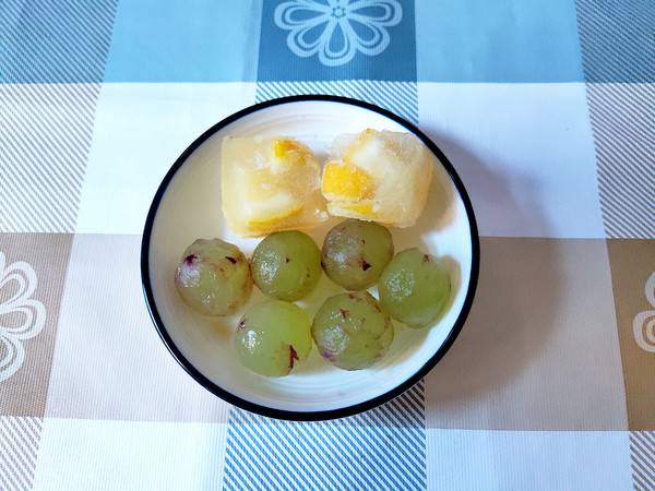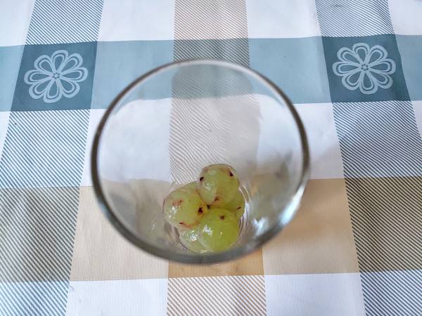 用料:葡萄6颗、蜂蜜柠檬冰块2个、蝶豆花6朵、热水200毫升、凉白开适量。