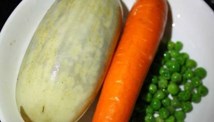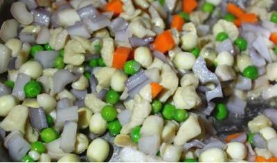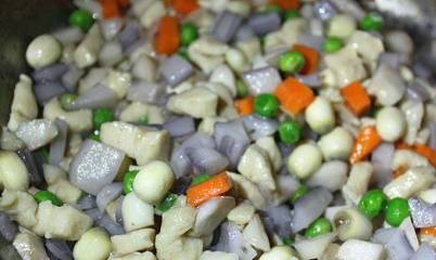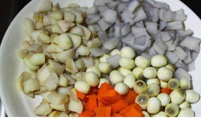 1、准备材料:藕100克、莲子80克、鸡胸脯肉80克、胡萝卜50克、青豆50克、植物油1勺、淀粉1勺、食盐6克、水适量、黄酒半勺、白胡椒粉1茶匙、红菱100克。