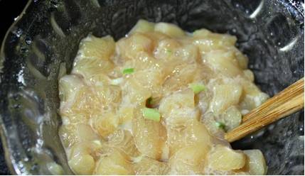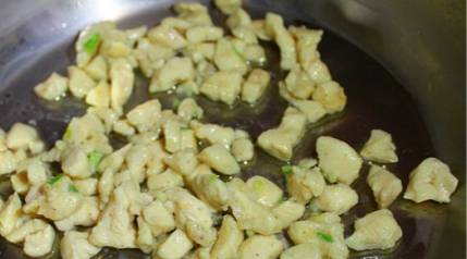 7、将腌制后的鸡胸脯肉用油煸炒熟。