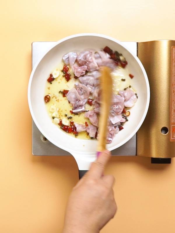 5、倒入田鸡,煸炒至变色。
