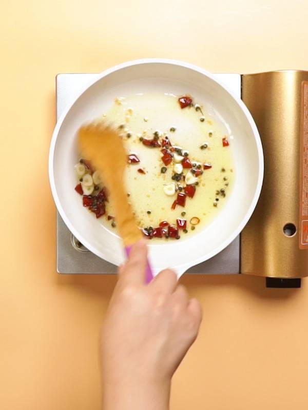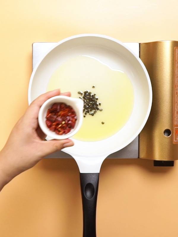 3、锅中倒油、麻椒、干辣椒,大火爆香。