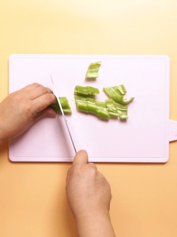7、倒入青椒,翻炒均匀。