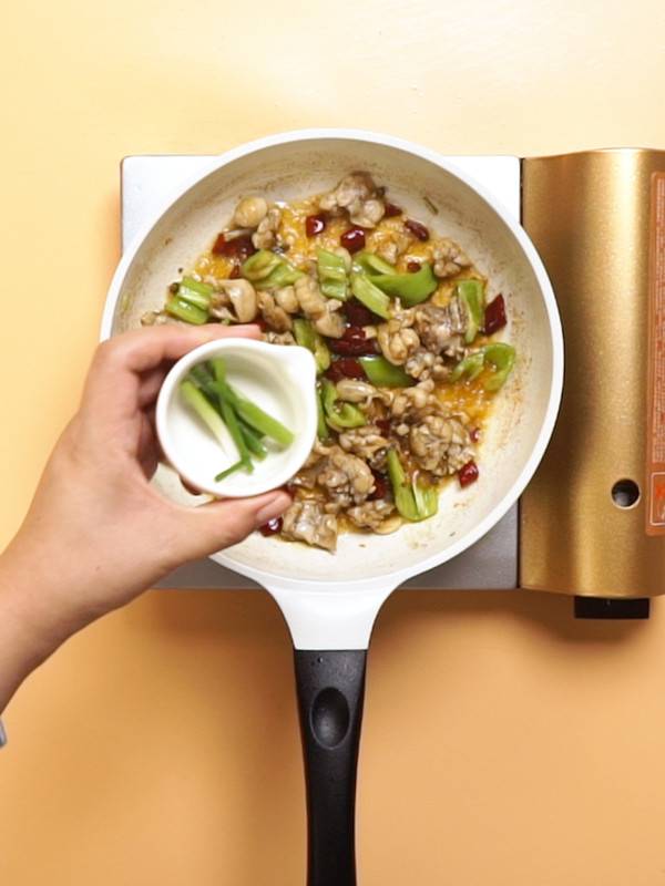 8、加入盐、葱段,翻炒均匀即可。