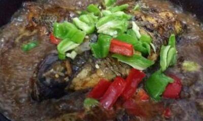 2、热油中小火煎鱼至两面金黄;倒入除青红椒外的所有配料,在鱼身上淋适量老抽继续煎半分钟。