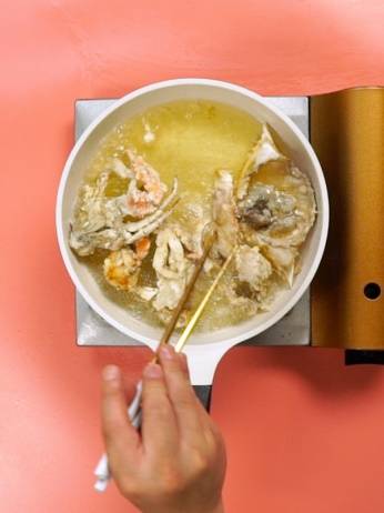 5、锅中倒入食用油200毫升,油温烧至七成热,放入梭子蟹,炸至变色。
