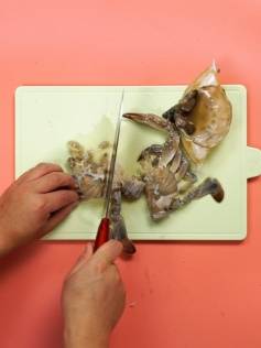 3、梭子蟹清洗刷净,去除尾部和蟹腮,切块。