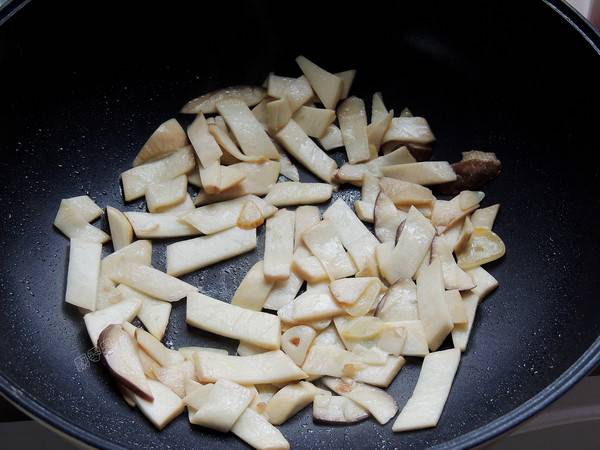 3、锅热油,放入蒜片爆香,放入杏鲍菇,小火煸炒至软。