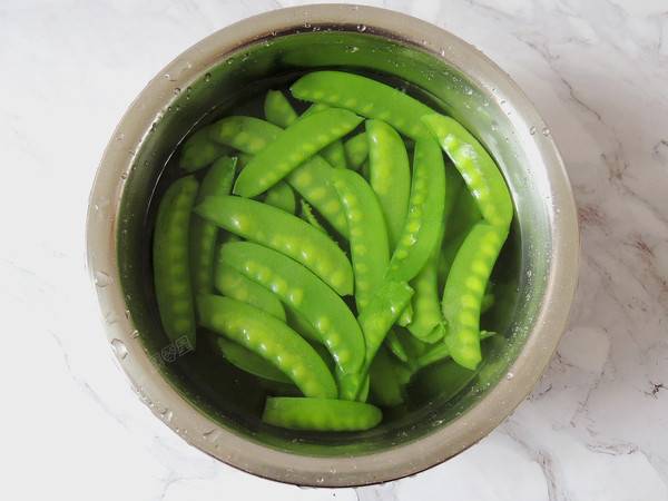 2、锅中加水,煮沸,放入少许盐和油,将荷兰豆放入锅中焯烫,将荷兰豆盛出,放入凉水中。