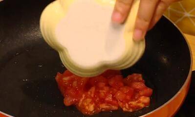 2、锅中倒入少量油,将番茄丁倒入翻炒出汁。