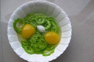 3、倒掉盐水,将苦瓜用清水冲一遍,挤去水分,加入两个鸡蛋、一茶匙盐。