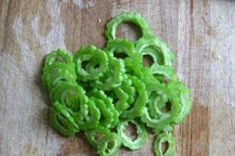 1、用筷子将苦瓜的瓤掏出,横切薄片。
