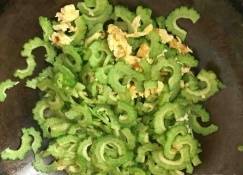 5、放入苦瓜翻炒,加盐、生抽、糖、醋,继续翻炒。