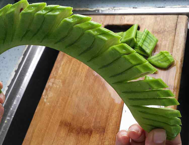 3、刀豆用盐水泡半个小时,洗干净,去两边老筋,晾干,切花,然后暴晒半天。