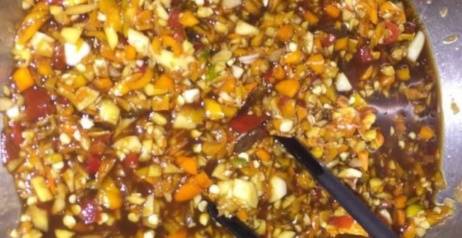2、辣椒、姜、蒜洗干净,切成碎末,放入盆中,加入生抽、香醋、冰糖、盐,拌匀,然后用保鲜膜封起来放冰箱冷藏备用。