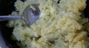 2、土豆趁热放入白糖和盐,用勺子压碎,越碎越好,压成泥。
