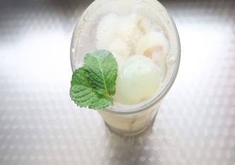 3、夏日荔枝气泡饮:荔枝剥好放进罐子里,一层荔枝一层冰糖的往上叠加;装满瓶子后,盖盖密封,放进冰箱里24小时后拿出杯子,倒入荔枝蜜和冰块,倒入苏打水即可。