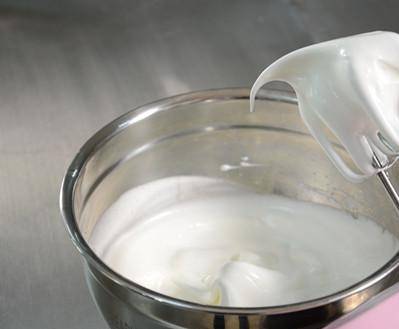 4、在蛋清里面加入几滴柠檬醋,再加入20g的白砂糖,用电动打蛋器把蛋清打发。