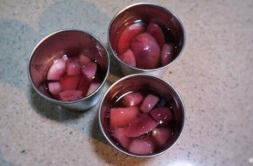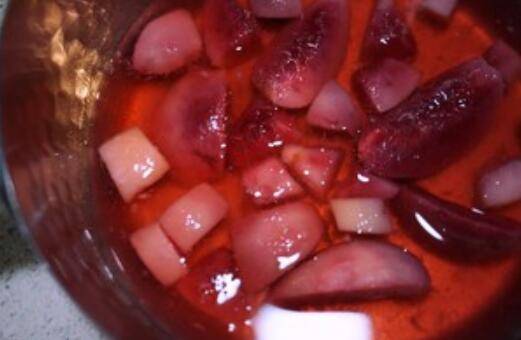 3、清水、白砂糖、柠檬汁、桃子小火加热至白砂糖融化,继续加热两三分钟关火。略煮一下就好了,千万别煮得软烂。