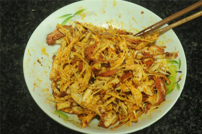 4、卤鸡胸肉撕成条。