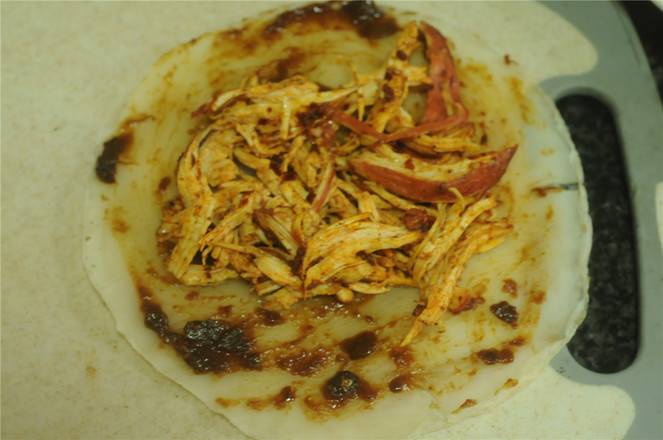 8、将鸡丝放在中间,铺平。