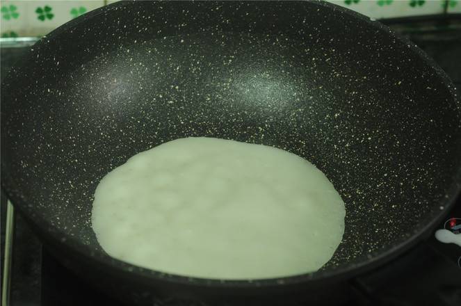 6、舀一勺面糊倒入锅中摊开,直至饼皮完全凝固即可取出,接下来,照着这个方法,把所有的饼皮都烙好。