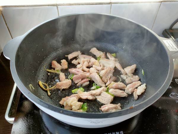 6、淋上少许的原汁酱油,炒至猪肉全部变色。