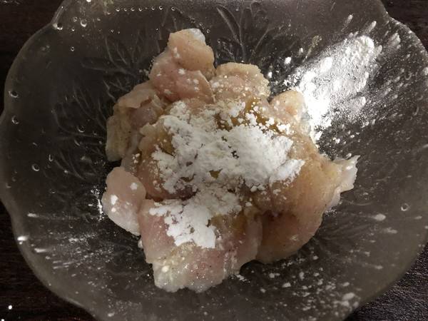 2、巴沙鱼放入盆中加入适量料酒、盐、白胡椒粉、鸡粉、淀粉和葱油,拌匀腌制15分钟。