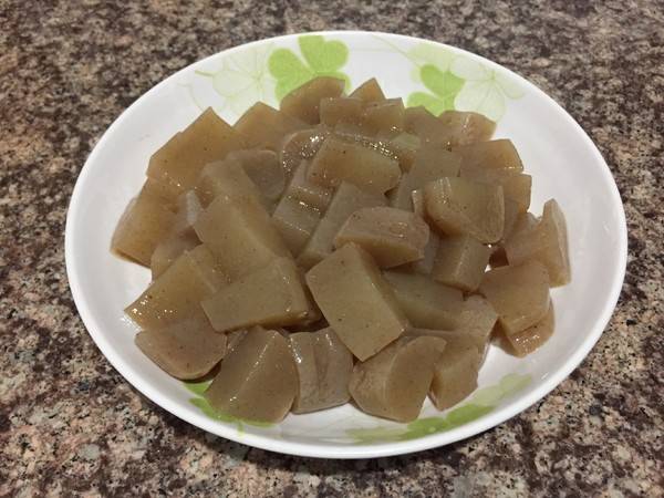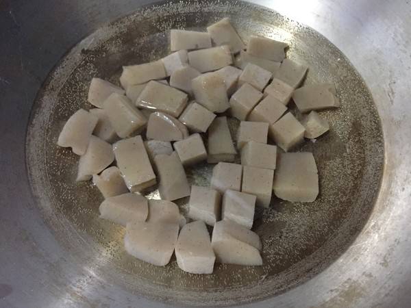 3、锅内将水烧开倒入魔芋豆腐加入少许盐,焯烫1~2分钟。