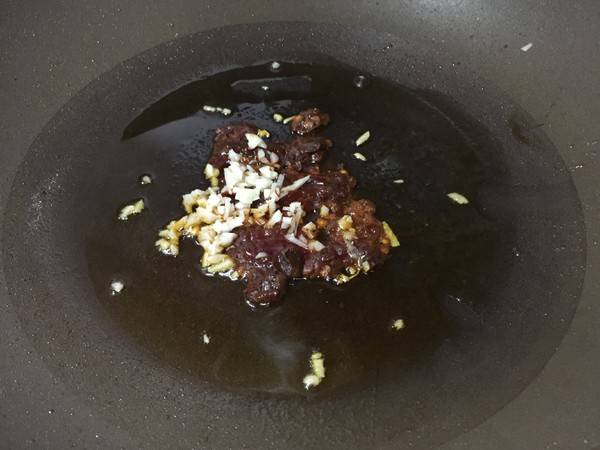 4、将锅先烧热,倒入凉油,将豆瓣酱倒入进行煸炒。
