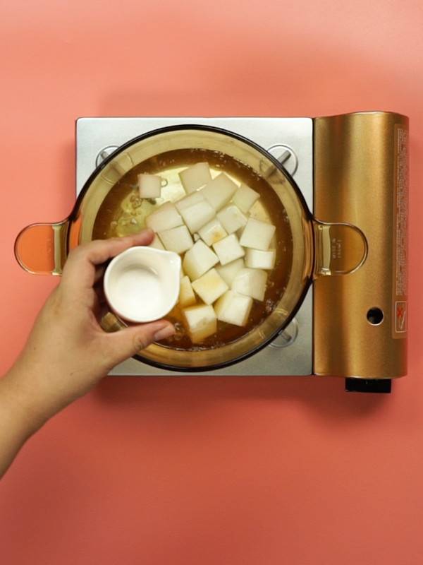 3、锅中加水,大火煮沸,倒入冬瓜,加入生抽,盐。