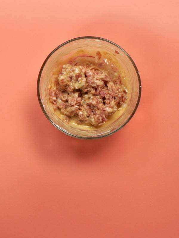 2、容器中加入猪肉馅,倒入鸡蛋清,白胡椒粉,生抽,盐,淀粉,搅拌均匀,用勺子汆成肉丸。