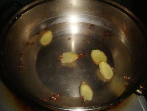 6、锅里另加水,放入姜片。