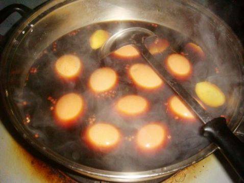 最佳答案:准备材料:主料鸡蛋10个、食盐3g、酱油30ml、姜适量、八角1粒、花椒3g、料酒15ml、白糖适量。鸡蛋洗净,放入锅中加水煮开,再转中火煮5分钟。取出鸡蛋。锅里另加水,放入姜片、花椒、八角、酱油、料酒、白糖、盐、鸡蛋,鸡蛋敲打出裂纹。大火烧开,转小火煮30分钟。煮至汤汁浓稠即可。