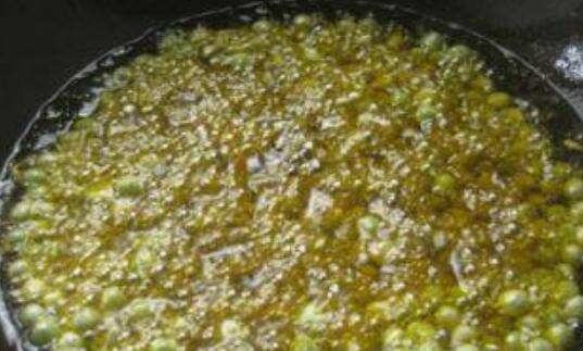 2、把植物油倒入锅中加热,加热至八成热时,把泡好的豌豆陆续放入锅中炸,炸至豌豆在锅内发出相互碰撞的响声即可捞出。
