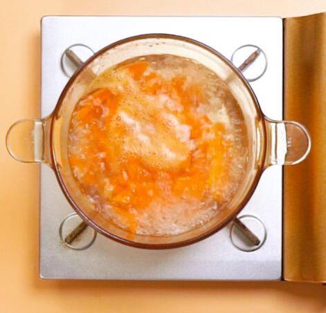 2、开水下锅,倒入胡萝卜片,焯水1分钟。