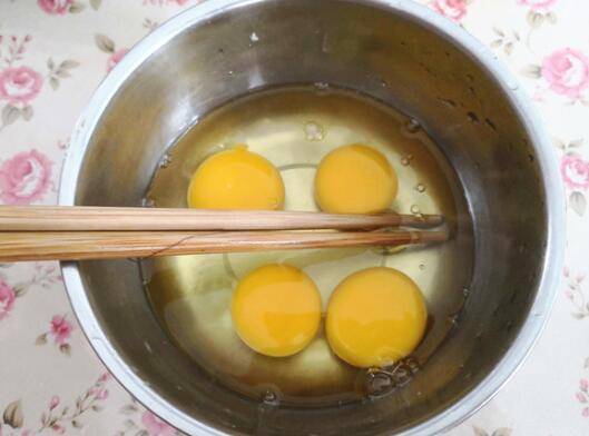 2、鸡蛋打入碗里,加少许盐一起打散,盐可以提鲜,这样炒出来的鸡蛋更好吃。