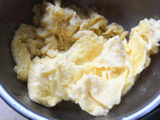 3、锅热后放入食用油,开始炒鸡蛋,要想把鸡蛋炒得膨松且鲜嫩,也是有技巧的,一是油要多放一些,二是要大火,油要热,三是鸡蛋下去先不要动,稍微成形后用铲子搅动几下,无液体了就出锅。