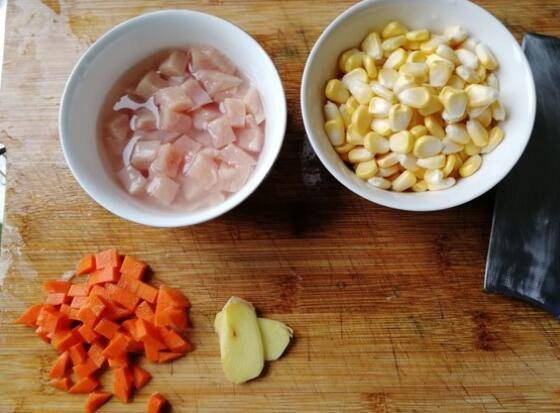准备材料:鸡胸肉一块、玉米粒一小碗、胡萝卜一小段、玉米油30毫升、盐1-2勺、鸡精一点点、清水适量、姜片2-3片、玉米淀粉适量。