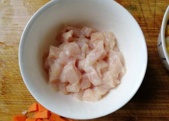 最佳答案:准备材料:鸡胸肉一块、玉米粒一小碗、胡萝卜一小段、玉米油30毫升、盐1-2勺、鸡精少许、清水适量、姜片2-3片、玉米淀粉适量。鸡胸肉清洗干净切丁,胡萝卜去皮,洗净切丁,姜切片。鸡胸肉加入半勺盐,加入一点玉米淀粉,用手抓匀2两分钟。静置5分钟。让鸡胸肉入味,更嫩。