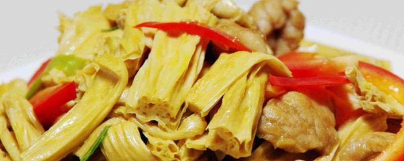 准备材料:腐竹100克、猪肉60克、彩椒1/2个、食盐2克、生抽2茶匙、淀粉1茶匙、葱1根、姜3片、植物油1汤匙。