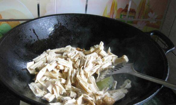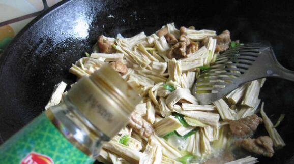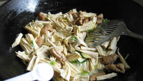 3、然后下猪肉煸炒变色,再加入葱丝炒出香味,下入切好的腐竹翻炒。