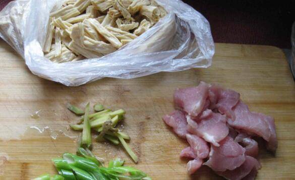 1、腐竹清水泡一晚第二天洗洗切段,天热放冰箱泡,猪肉切片,葱姜切碎。