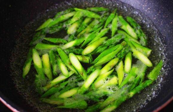 5、加入焯水的芦笋,根据个人口味,加入适量的盐和鸡精调味。