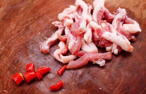 2、把猪肉用刀切成条状,小米辣切成小丁。