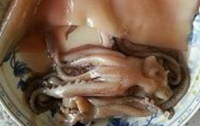 3、水烧开放入两片姜,下鱿鱼焯水,鱿鱼变卷后捞起待用。