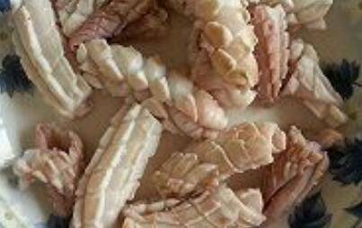 1、鱿鱼开膛,去内脏撕掉薄膜,然后清洗干净;在鱿鱼内面斜刀切十字花纹,然后切片。