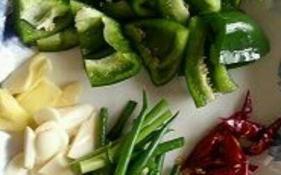 2、青椒切块,香葱切段,姜蒜切片,干辣椒剪短备用。