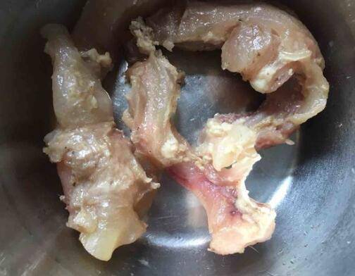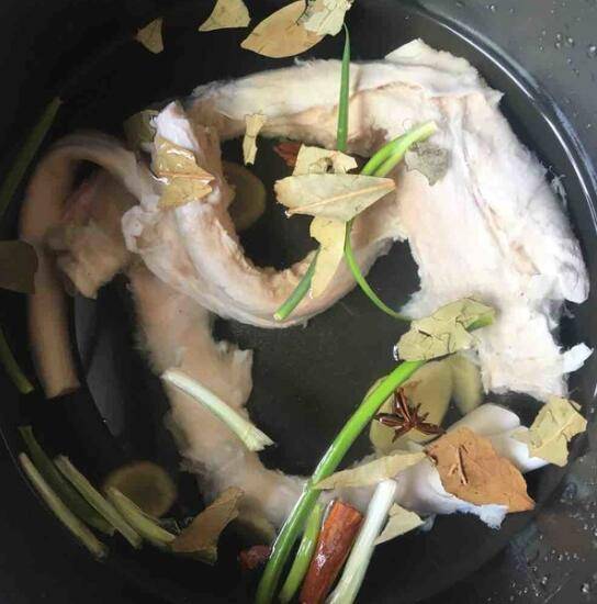 1、牛蹄筋洗净,牛蹄筋倒入电饭煲内胆中,继续放入生姜片、香叶、八角、桂皮、2勺料酒。